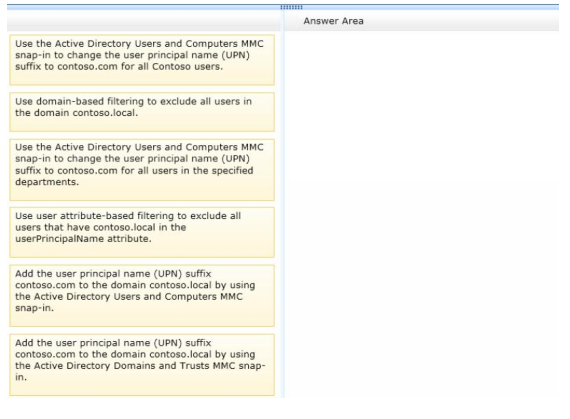 Question No : 9 DRAG DROP Contoso Ltd. plans to use Office 365 services for collaboration between departments. Contoso has one Active Directory Domain Services domain named contoso.local. You deploy the Windows Azure Active Directory Sync tool. You plan to implement single sign-on (SSO) for Office 365. You need to synchronize only the user accounts that have valid routable domain names and are members of specified departments. Which three actions should you perform in sequence? To answer, move the appropriate actions from the list of actions to the answer area and arrange them in the correct order.